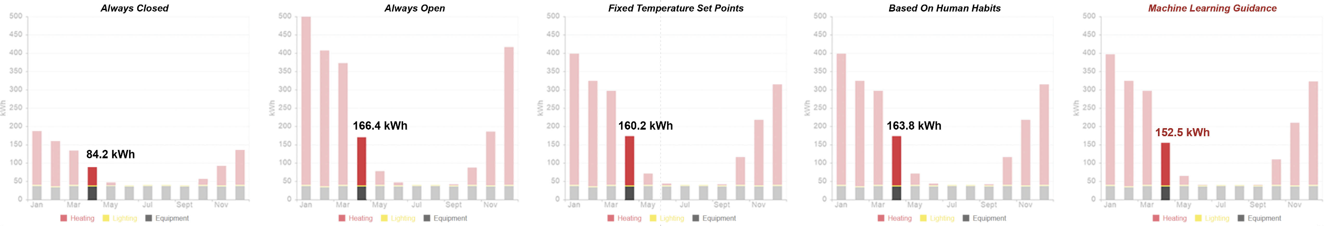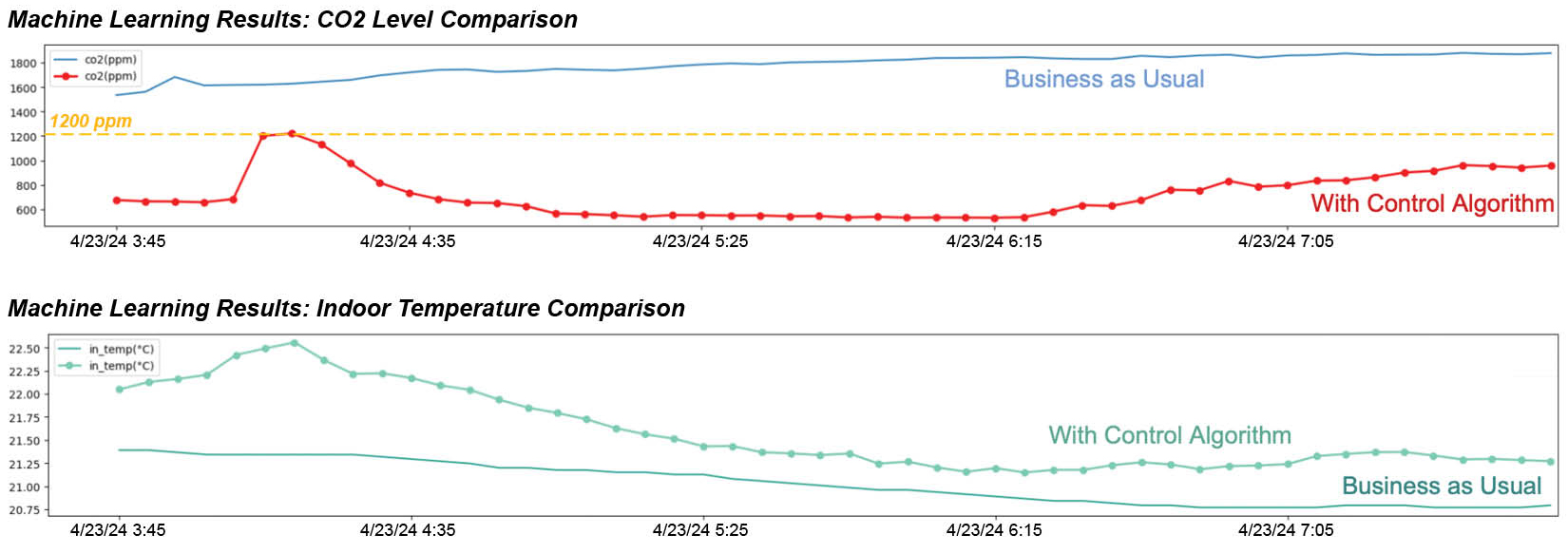 The machine learning control system demonstrated notable improvements in both indoor environmental quality and energy efficiency. The results revealed a significant reduction in CO2 levels, reflecting the system's capability to enhance air quality through optimized ventilation strategies. While the system achieved slightly higher indoor temperatures, this difference was minimal due to the testing occurring during the shoulder season, when outdoor temperatures were moderate. Despite this, the system still exhibited reduced energy consumption compared to traditional fixed temperature set-point controls, showcasing its ability to efficiently balance comfort and resource conservation.